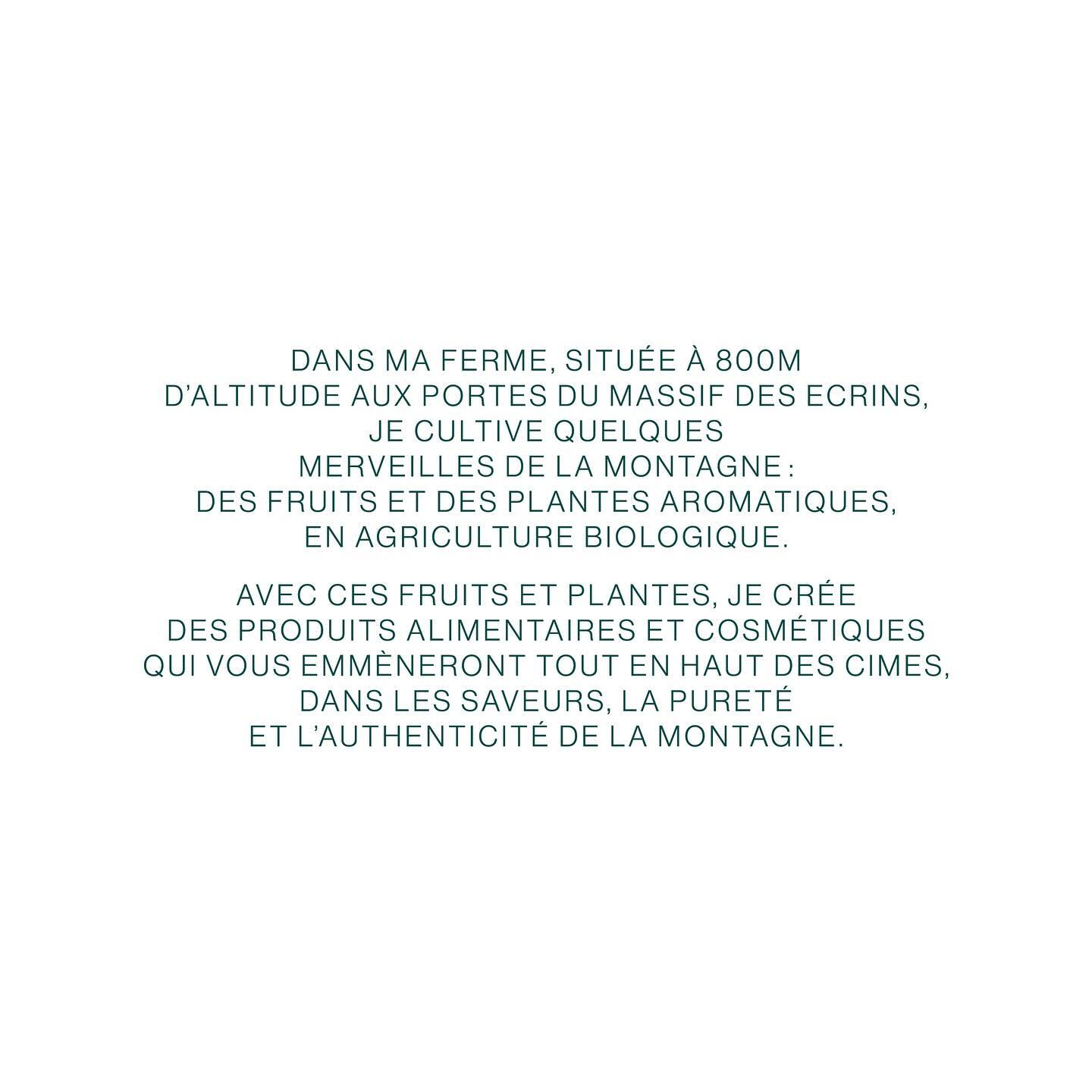 Avec ces fruits et plantes, je crée des produits alimentaires et cosmétiques qui vous emmèneront tout en haut des cimes, dans les saveurs, la pureté et l'authenticité de la montagne.